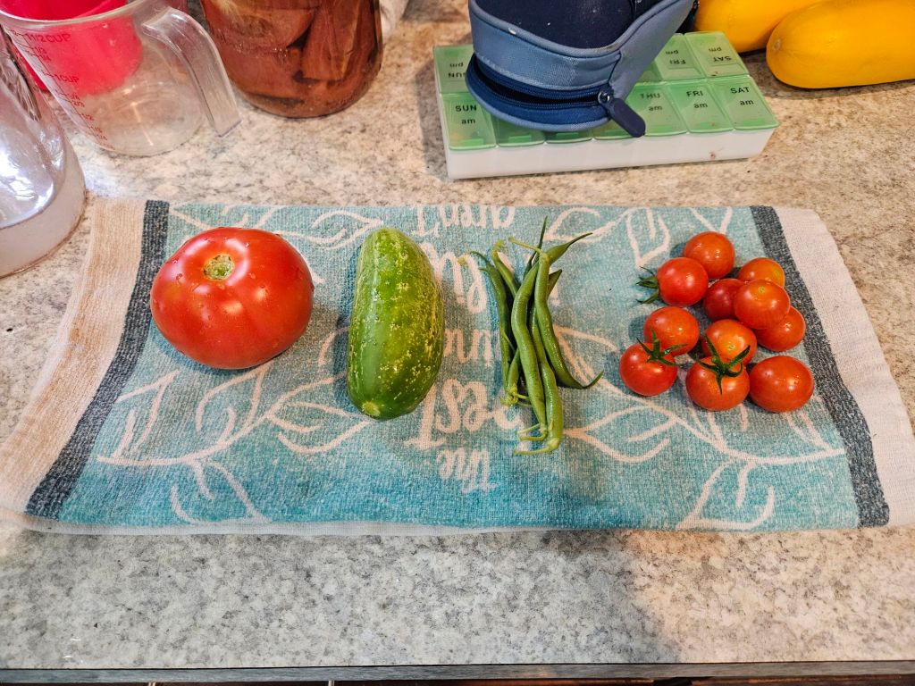 We ended the day with some gardening! I was able to harvest another tomato, cucumber, green beans, and a bunch of cherry tomatoes!🍅