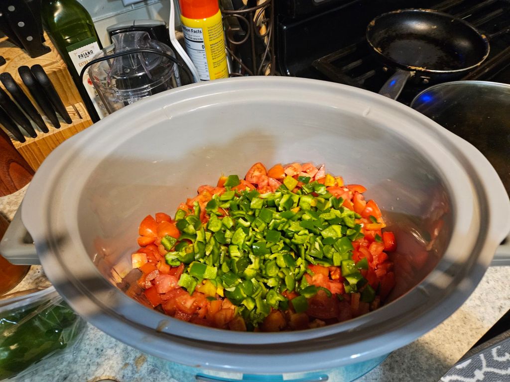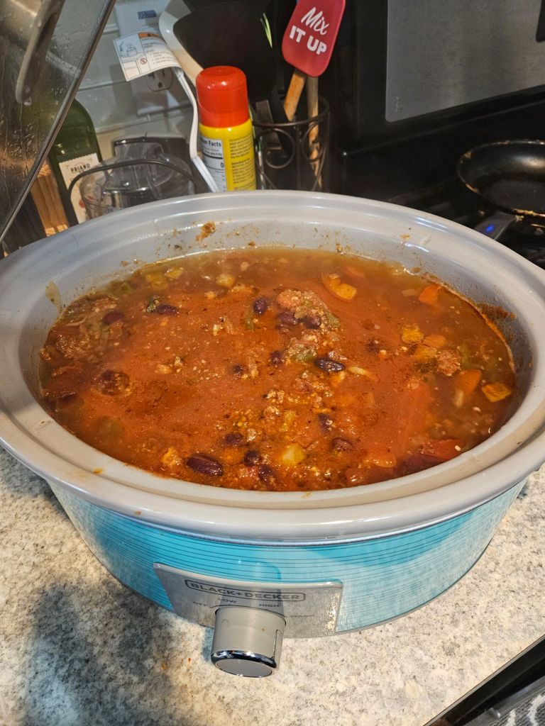 🌟 It’s back! Yup, you guessed it—Crockpot Sunday! 🍲 What’s Julie cooking today? Homemade chili! 🌶️🍅 With a ton of fresh tomatoes and green peppers straight from my garden, I decided to whip up a batch of chili today. It’s the perfect day for something warm and hearty because the weather outside is giving off those cozy fall vibes! 🍂