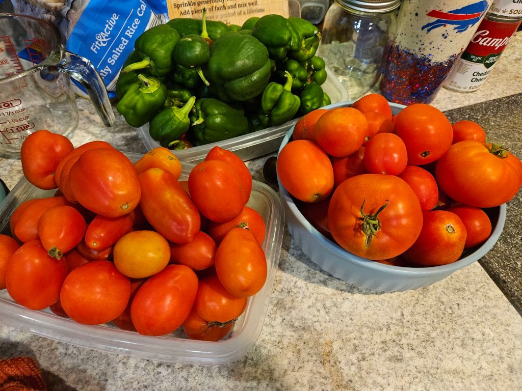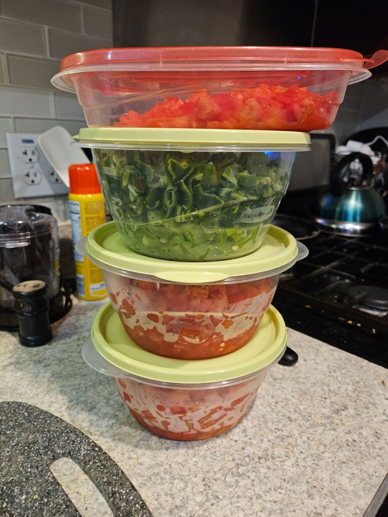 After getting the Taco Bake going, I spent some time in my garden prepping my latest haul of tomatoes and green peppers for the freezer. I diced them all up and portioned them into bowls to save for those cozy soups and chili sessions I know I’ll want this winter. 🍅🫑 By the end, I had three containers of tomatoes and one of green peppers ready to go! The best part? My garden is still producing, so there’s more where that came from.