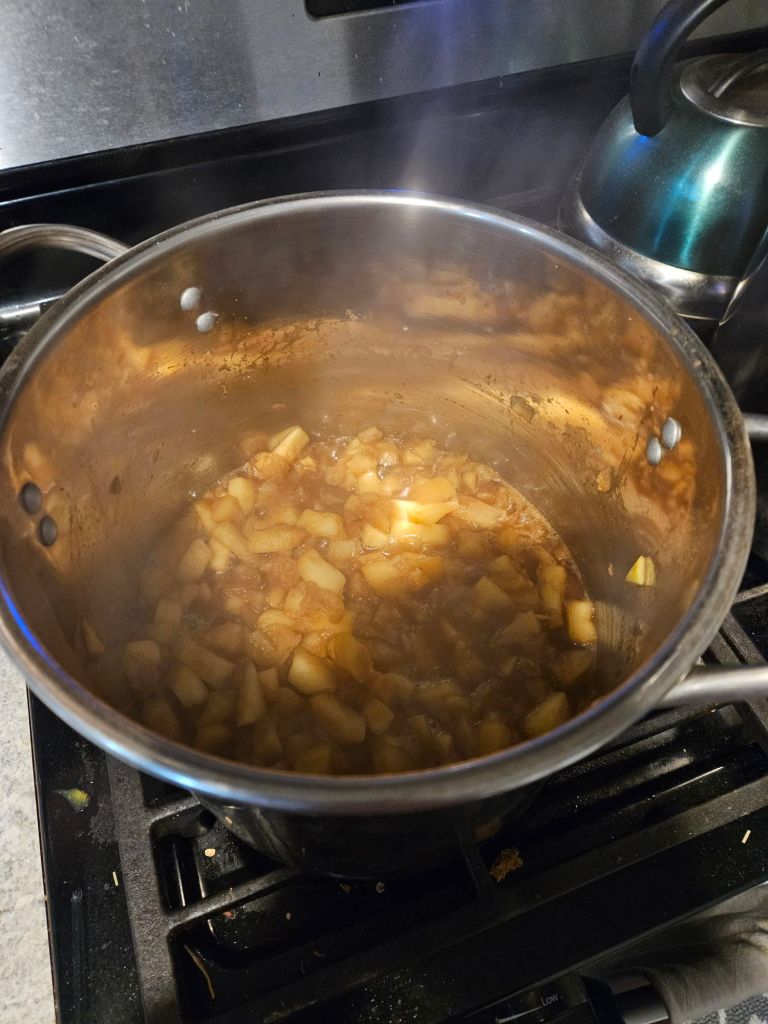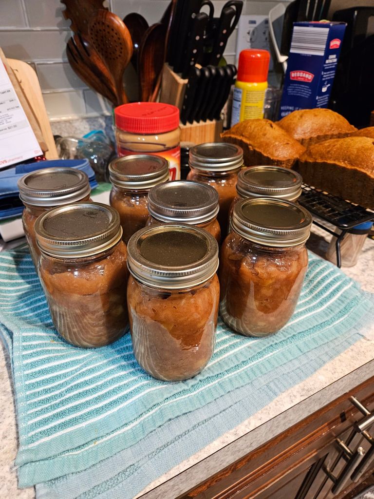 Next, I tackled nearly half a bushel of Crispin apples🍏. These beauties were peeled, sliced, and prepped for not only homemade applesauce but also enough apple slices to freeze for two pies later on! My applesauce is always made by instinct—I trust my taste buds over any recipe. This batch resulted in eight pint-sized jars, with just enough left over for me to enjoy a fresh bowl right away. It’s moments like this that make all the effort worth it.🥰