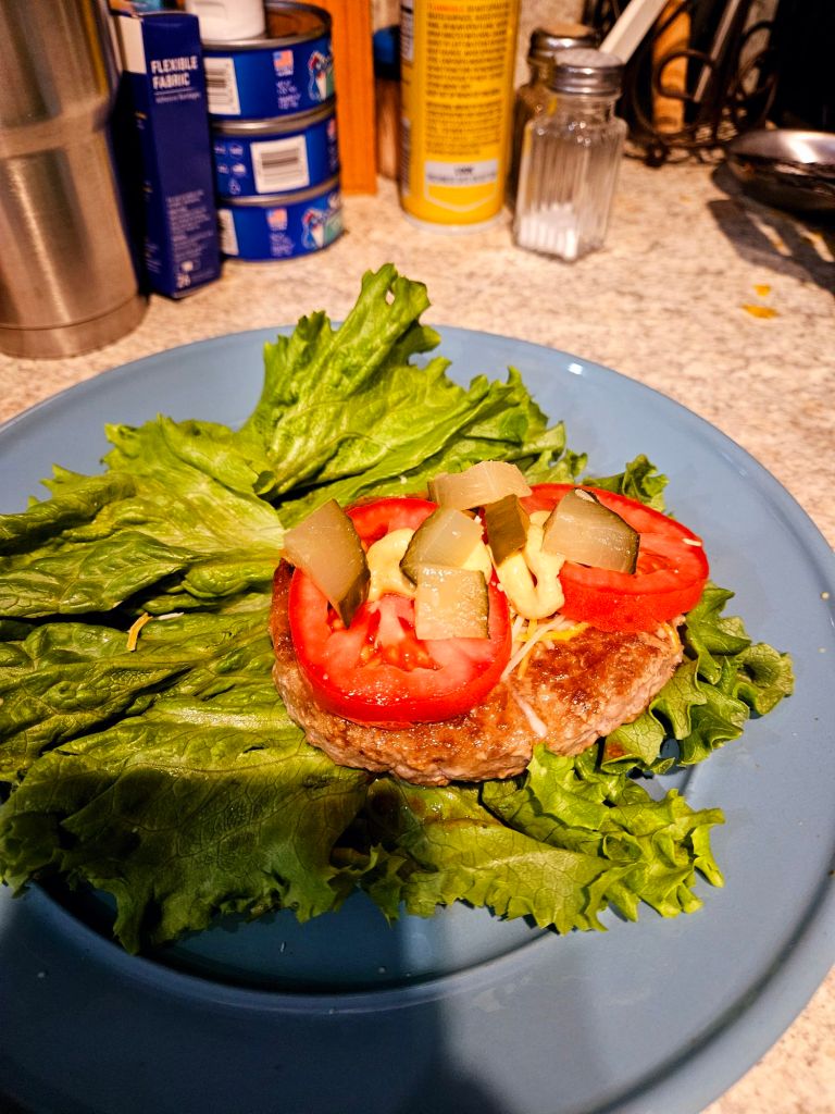 While the laundry was running its cycle, I started book #8 for the year. 📚 I’m already halfway through! I had to take a break to make dinner—tonight, I made a delicious turkey burger 🍔 with homemade pickles 🥒 and tomatoes 🍅 on a lettuce “bun.” It was simple but so satisfying. 😋