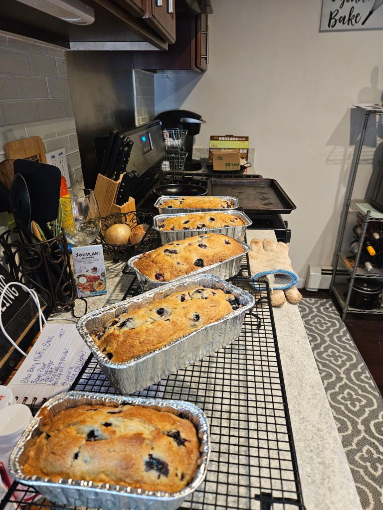 After lunch, it was time to cool down with a little reading 📚 and relaxing… but then the baking itch struck again! 👩🍳🫐 I whipped up four full-sized loaves and one mini loaf of Blueberry Muffin Bread. Three loaves made it straight over to my neighbors (still warm! 🥰), and the mini one? Well… Bella and I had to sample it for quality control purposes. 😉🫣