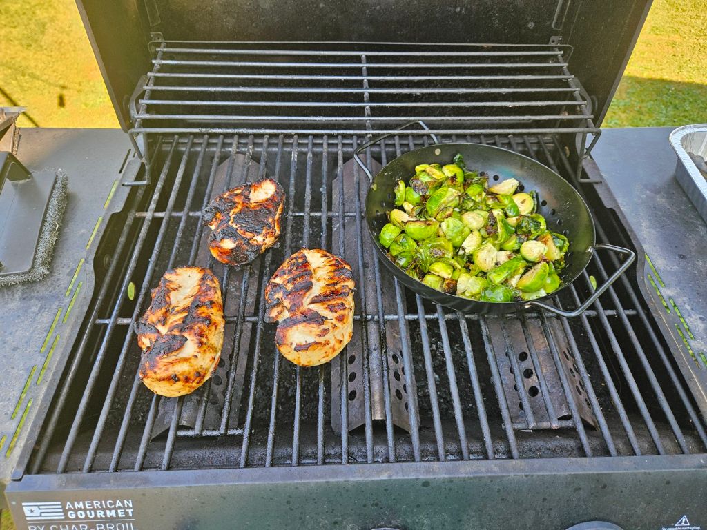 I marinated some juicy chicken breasts in Olive Garden Italian dressing π§π₯ overnight and all day. They turned out so flavorful and tender π€€π. Alongside the chicken, I tossed some halved Brussels sprouts π₯¦ in olive oil, salt, and black pepper and grilled them up to perfection. Even Bella got in on the actionβjust a few crunchy Brussels sprout leaves for her princess palate πΆππ