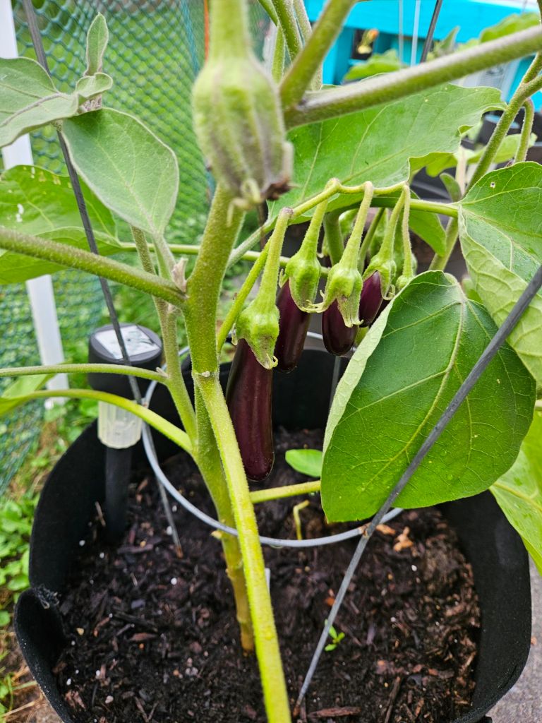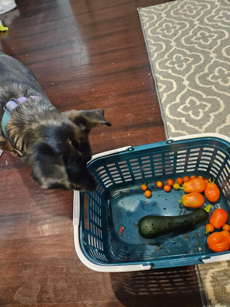 Speaking of eggplants—they’re growing more each day! I chose a smaller variety, which is perfect for a one-person household. Bella inspected today’s harvest like the garden supervisor she is, but let’s be honest… I think she was just checking for snacks. 😄🐶