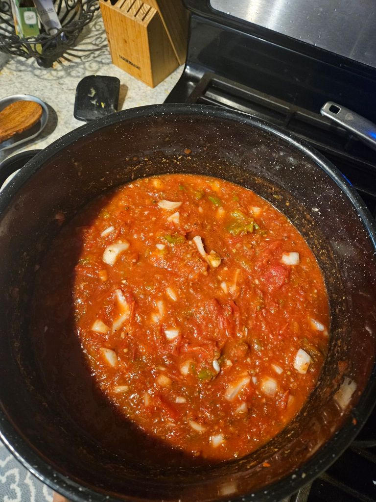Once all the tomatoes and peppers were roasted and chopped, I tossed them into the pot π² with the rest of the ingredients, plus my own secret touch π€«. Thatβs when Bella decided it was time for our late-morning walk πΆββοΈπ. So, we took a quick break, enjoyed some fresh air π, and then came back ready to finish the job.
