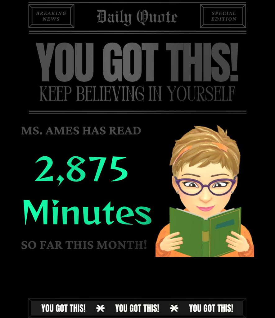 One of my students even got to share her total β her classmates nominated her because sheβs the biggest reader in the room. Sheβs already read over 1,000 minutes this month! π²π I definitely have my work cut out for me keeping up with her!